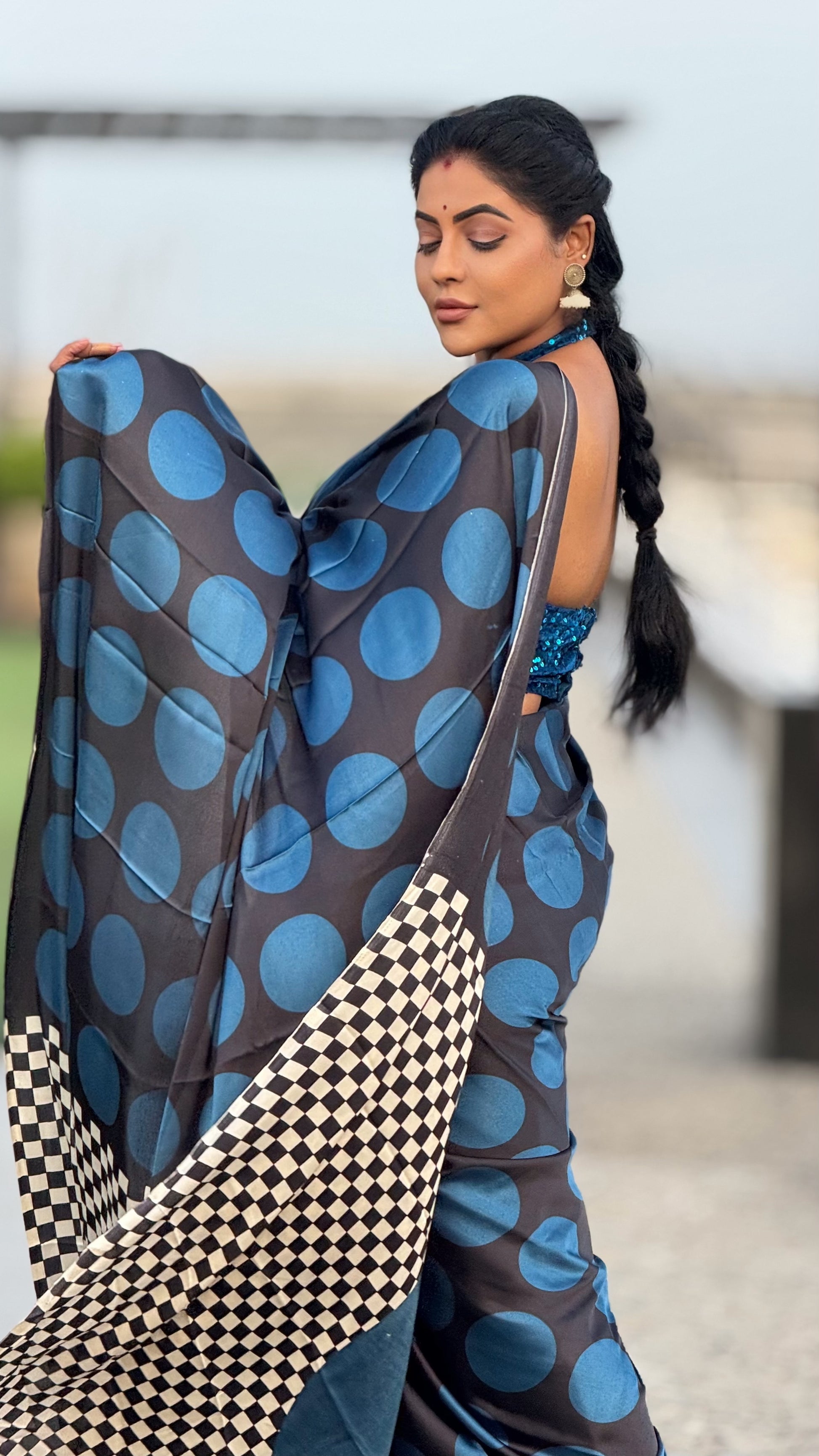 Work - Ajrakh modal saree black and blue Dots with running blouse