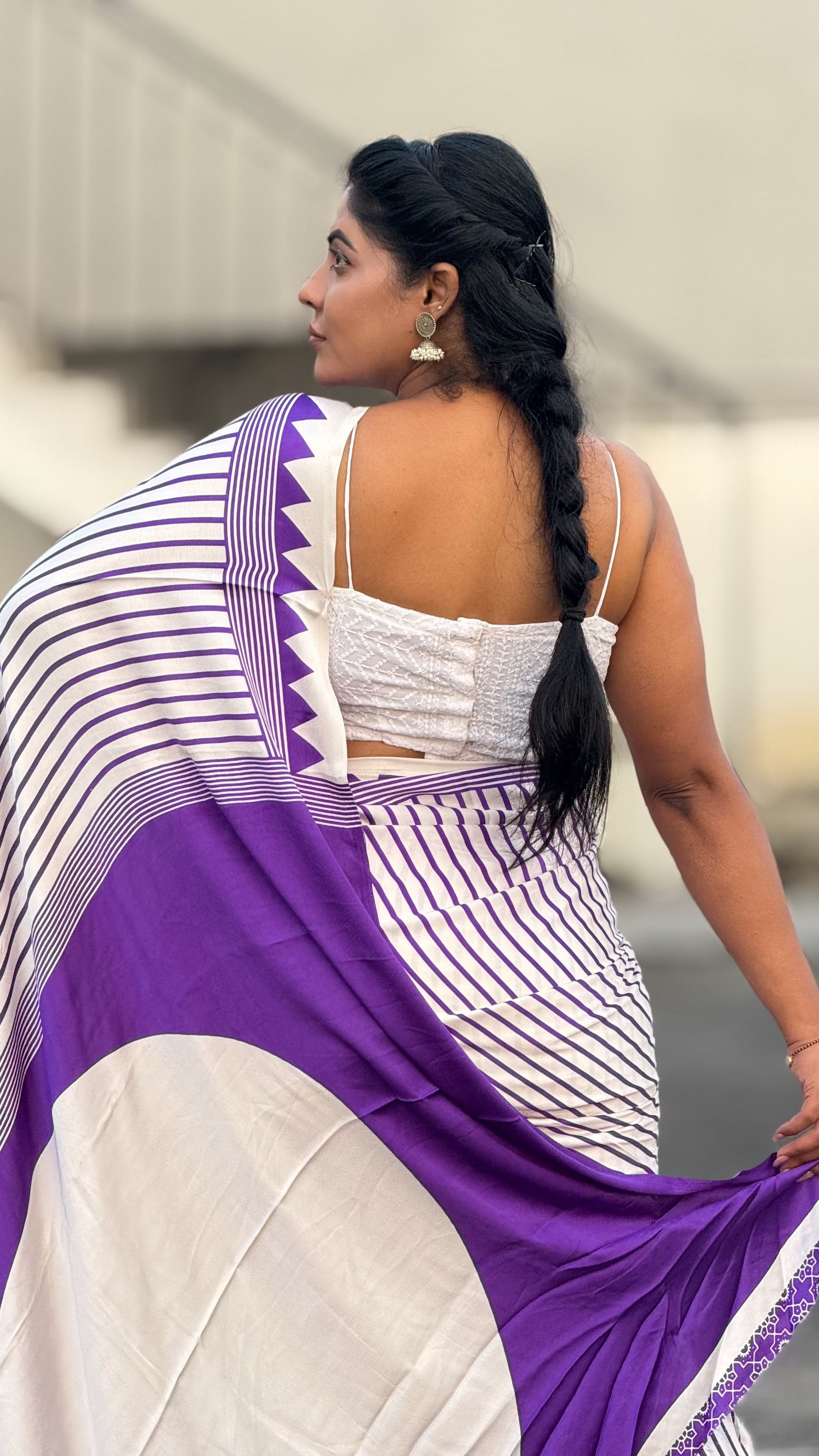 Work - Ajrakh modal saree purple & white striped pattern with running blouse